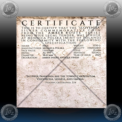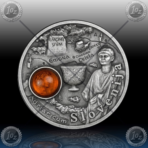 *Ta unikatni srebrnik je izdaja v prestižni seriji "Jantarna pot", posvečeni starodavni trgovski mreži, ki je oblikovala zgodnjo evropsko civilizacijo. Ta izdaja, ki jo je izdal Niue, se osredotoča na Slovenijo, dom Emone, ene najpomembnejših rimskih kolonij v regiji in strateškega križišča med Jadranskim morjem in srcem cesarstva.