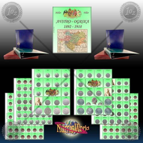 Album za AVSTRO-OGRSKE (Avstrija in Madžarska) kovance z vložnimi list i(žepki), vmestnimi listi na katerih so naslikani VSI REDNO IZDANI KOVANCI Avstro ogrske( 6 listov) od leta 1892 - 1918.