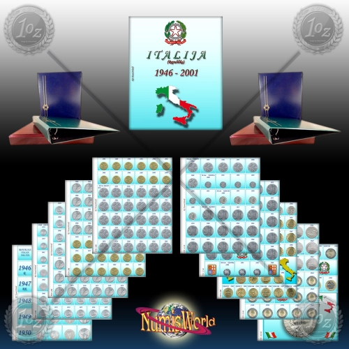 Album za ITALIJANSKE kovance z vložnimi listi (žepki) ,vmestnimi listi na katerih so naslikani VSI REDNO IZDANI KOVANCI ITALIJE od leta 1946 - 2001 ( torej kovanci ki so bili v obtoku )..