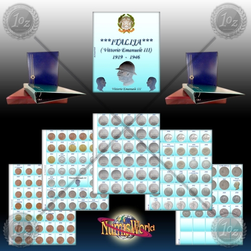 Album za ITALIJANSKE ( Vittorio Emanuele III ) kovance z vložnimi listi (žepki), vmestnimi listi na katerih so naslikani VSI REDNO IZDANI KOVANCI Kraljevine ITALIJE ( razen redkih, ki so zelo dragi - nedostopni) od leta 1919 - 1946 ( torej kovanci ki so bili v obtoku )